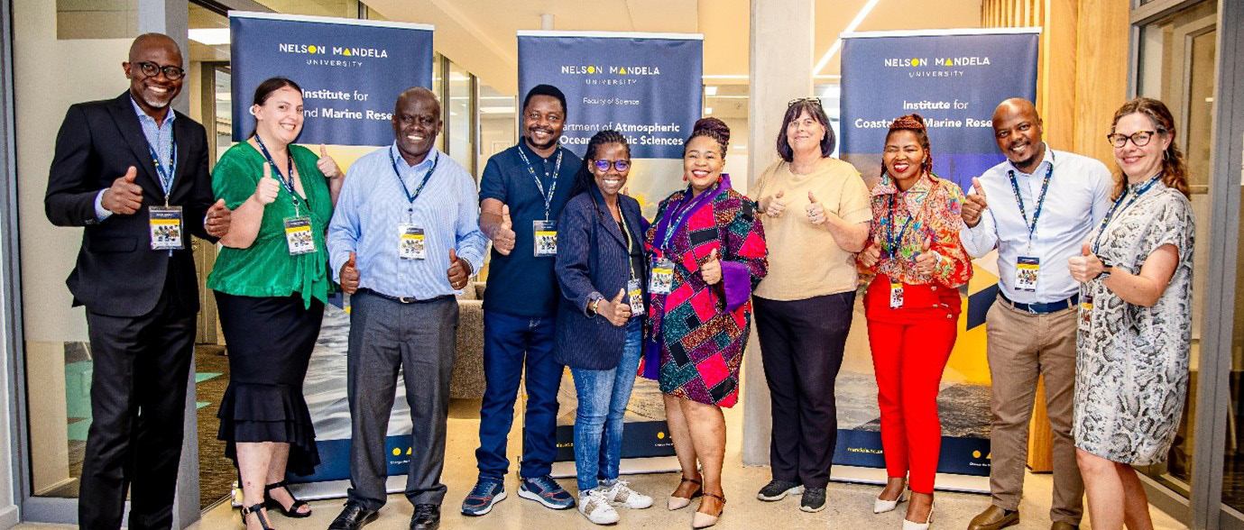 Prof Nelson Torto, The Swedish Foundation for International Cooperation in Research and Higher Educa-tion (STINT) Senior Science Fellow; Dr Mellanie Cilliers, Stellenbosch University; Prof. P.W. Bukhala, DVC PRI, Masinde Muliro University of Science and Technology (MMUST) in Kenya; Prof L Makhado; Dr Nokhuthula Mchunu, NRF; Dr Palesa Natasha Mothapho, Director Research Support and Management, NMU; Dr Denise Schael, Director Institute for Coastal and Marine Research (CMR), NMU; Mr Zolani Dyosi, NRF; and Ms Ms Maria Norton, University of Southampton, UK, Posing after the Funders’ Round Table Discussion